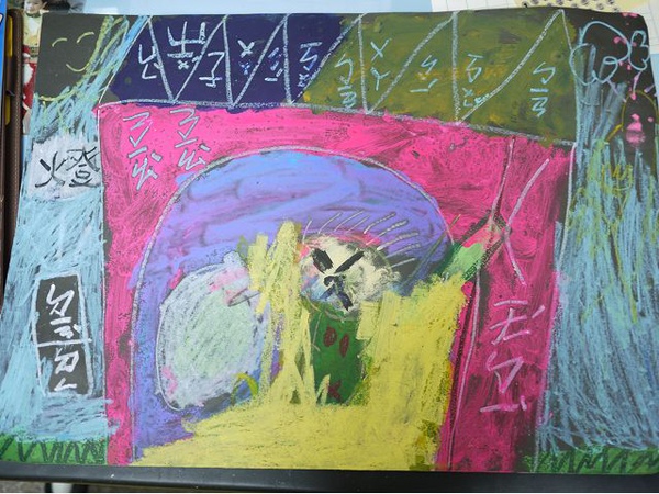 左邊的人物是畫他自己,眼睛下面多兩條線不是眼淚喔,他說是扮鬼臉啦